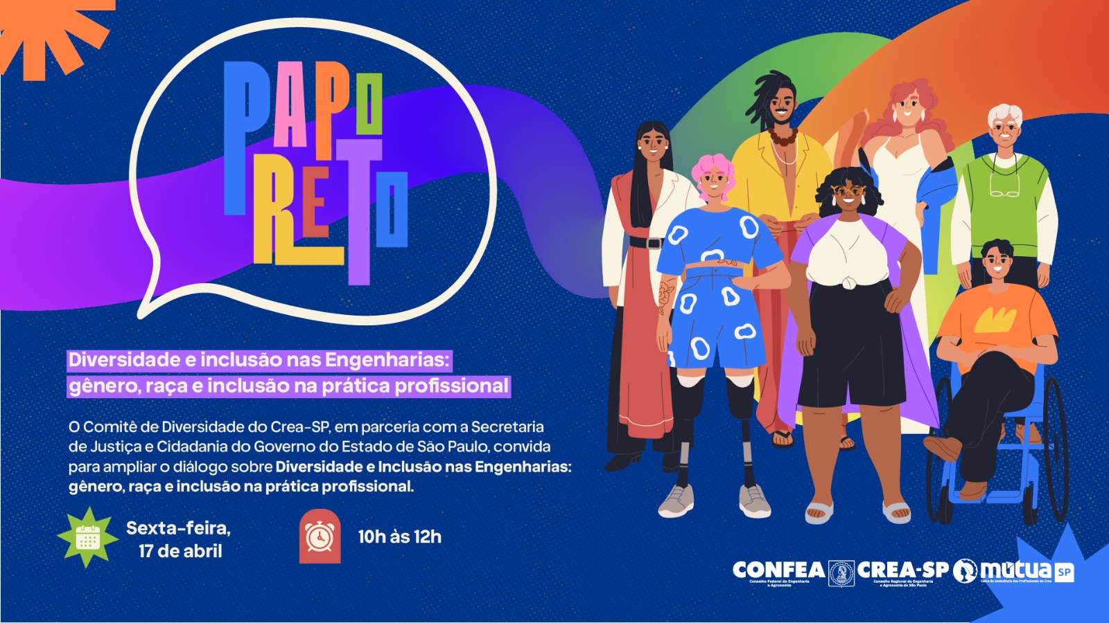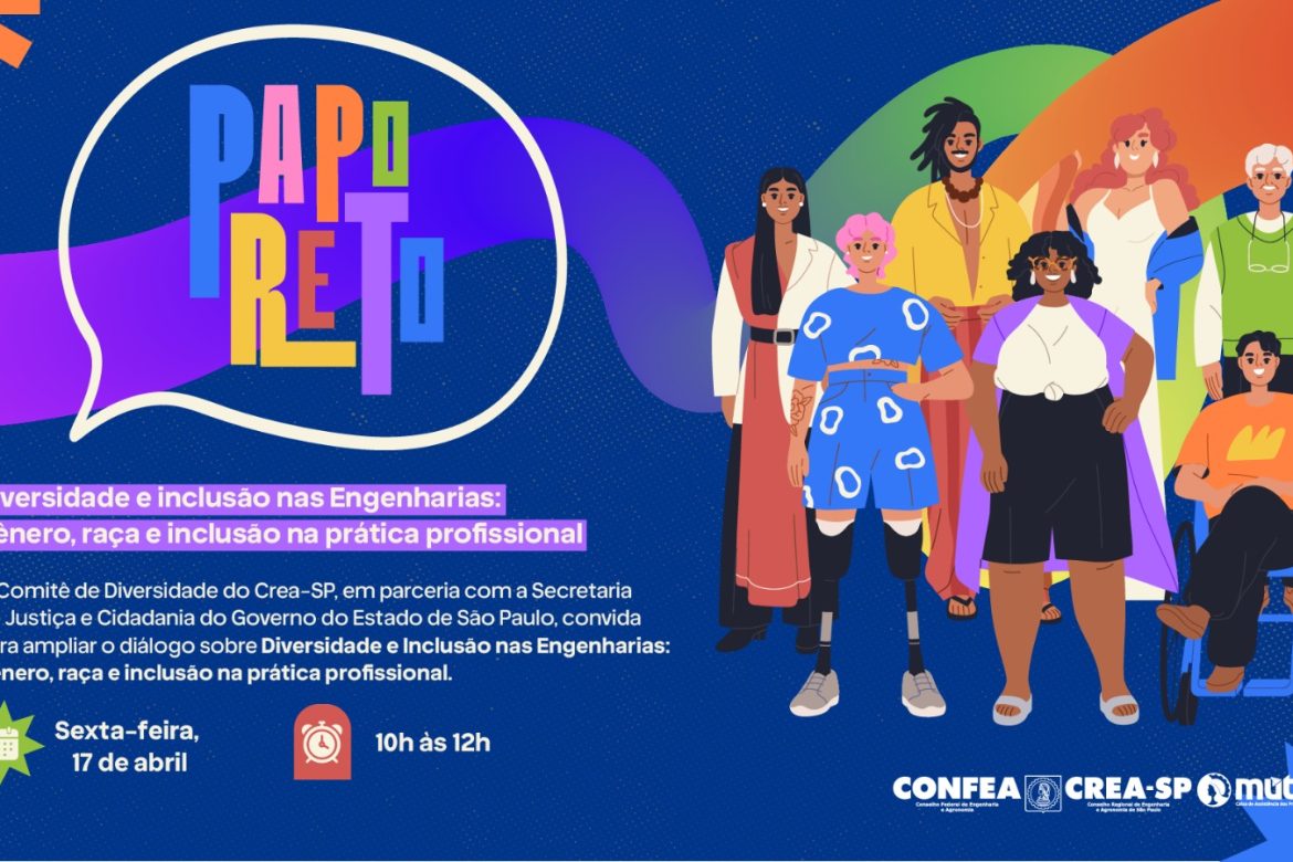 O Crea-SP, por meio do Comitê de Diversidade e em parceria com a Secretaria de Cidadania e Justiça do Governo do Estado de São Paulo, oferece a live Papo Reto, encontro que propõe ampliar o diálogo sobre os desafios e caminhos para uma atuação mais diversa e representativa na área tecnológica.